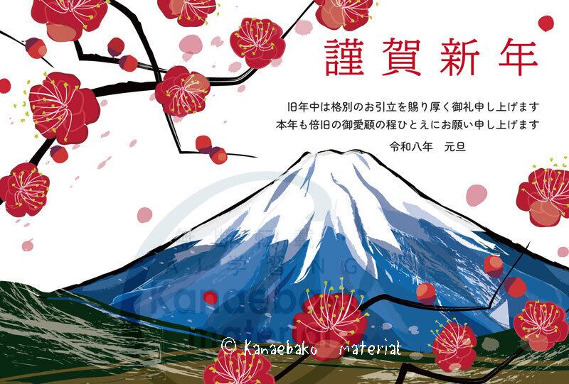美しい富士山と春の訪れを感じさせる梅の花が描かれており、特別な年賀状作成にぴったりです。きちんとしたご挨拶を華やかに彩ることができます。